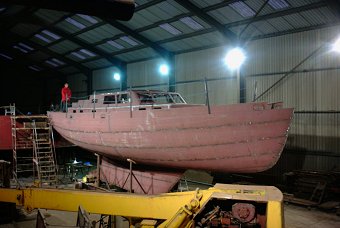 The hull is currently under construction by Voyager Boatyard, Cornwall.